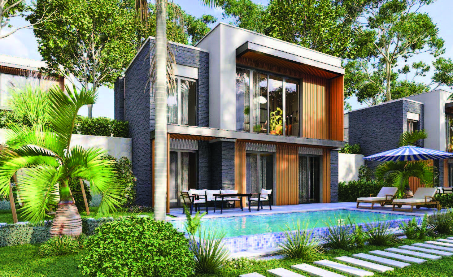 Her biri özel bahçe ve havuza sahip, mahremiyet odaklı tasarım.